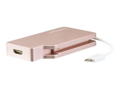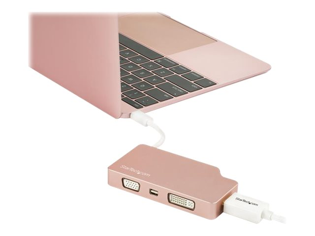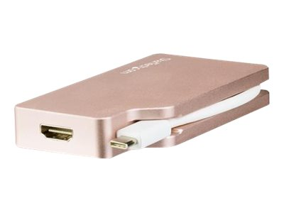Cet adaptateur vidéo USB-C multiport en or rose offre une solution portable pour connecter votre ordinateur portable USB Type-C à un écran VGA, DVI, HDMI ou Mini DisplayPort. L''adaptateur est également disponible en CDPVGDVHDMDP" text="argent (CDPVGDVHDMDP) et en CDPVDHDMDPSG" text="gris sidéral (CDPVDHDMDPSG).