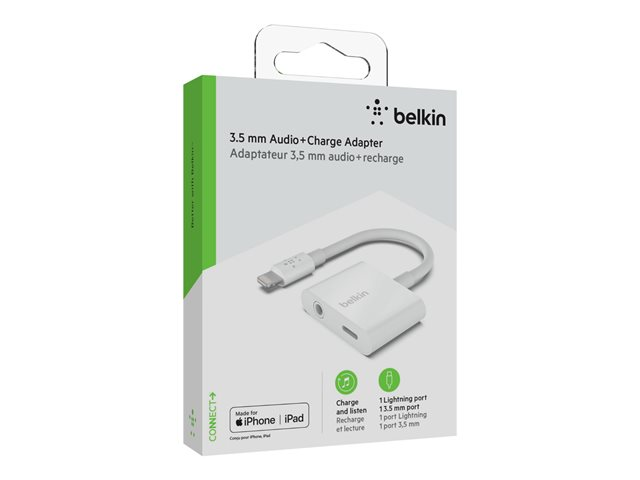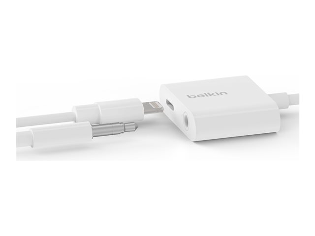 Description du produit Belkin 3.5 mm Audio + Charge RockStar - Lightning vers prise casque/adaptateur de charge - Lightning / audio Câble Lightning vers prise casque/adaptateur de charge - Lightning / audio Couleur Blanc Connecteurs Lightning - mâle Connecteurs (deuxième extrémité) Lightning - femelle