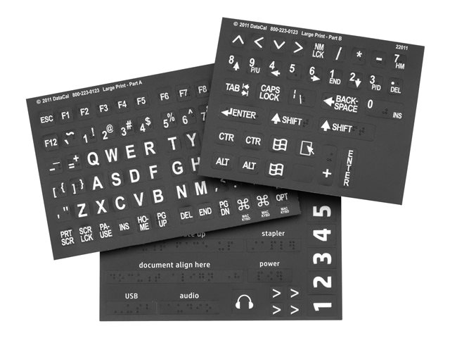 Le kit d'accessibilité HP comprend des autocollants personnalisés en braille et tactiles, une poignée d'accessibilité et le clavier BigKeys LX pour une solution unique qui facilite l'interaction des personnes handicapées avec les imprimantes multifonction et scanners HP.