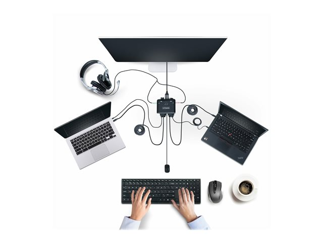 Ce commutateur KVM hybride permet aux utilisateurs de basculer entre un ordinateur de bureau compatible USB Type-A et DisplayPort et un ordinateur portable compatible USB Type-C (DP Alt-Mode), afin de partager un clavier, une souris, des périphériques d'E/S audio et un seul moniteur DisplayPort 4K 60Hz.